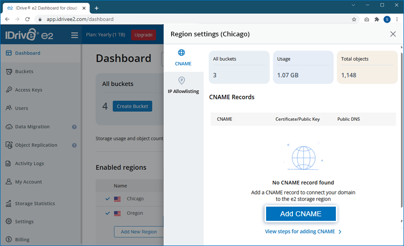 Yes, you can replace IDrive® e2 specific region domain names with your own domain names. You need to create a CNAME record for your domain name server and point that to your e2 region domain name. The Dashboard on the web console lists the IDrive® e2 specific domain names of each enabled region.
